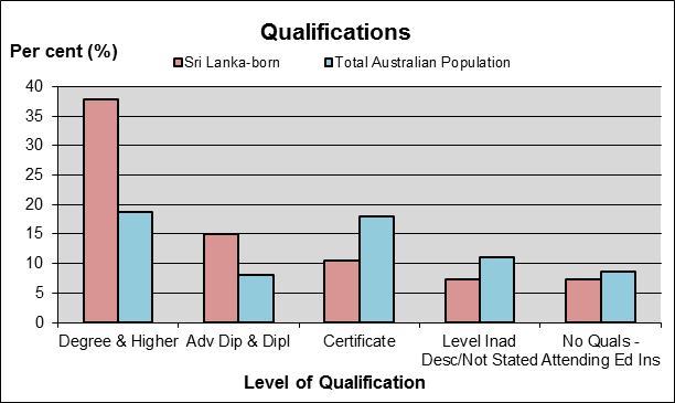 Qualifications: At the 2011 Census, 70.6 per cent of the Sri Lanka-born aged 15 years and over had some form of higher non-school qualifications compared to 55.9 per cent of the Australian population. Of the Sri Lanka-born aged 15 years and over, 7.3 per cent were still attending an educational institution. The corresponding rate for the total Australian population was 8.6 per cent.